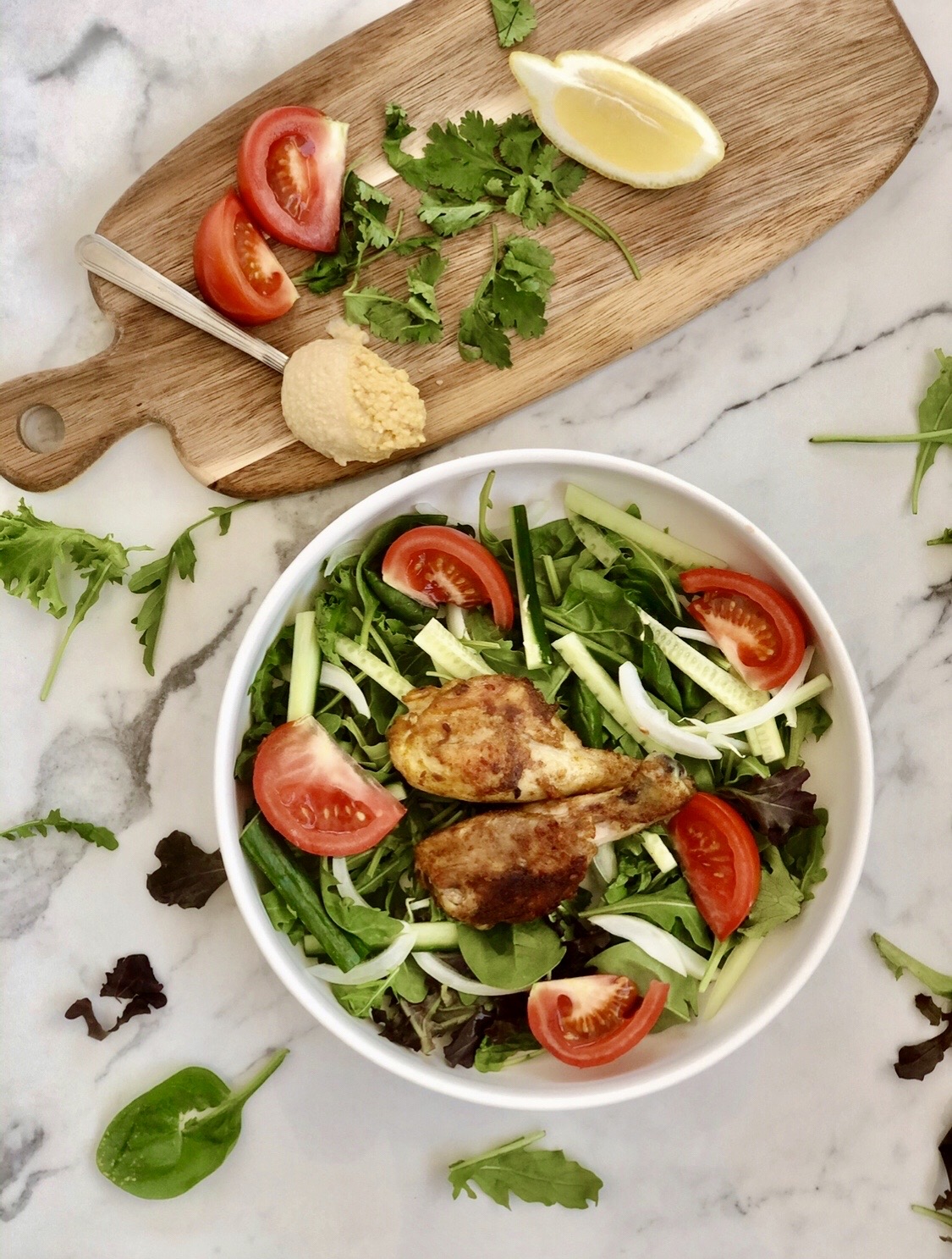 I used chicken for my protein and garlic hummus for my dressing. The chicken is really flavourful and the spices add a bit of warmth to the salad. The oil from the chicken and hummus mixed together, which made the salad taste rich in flavour.